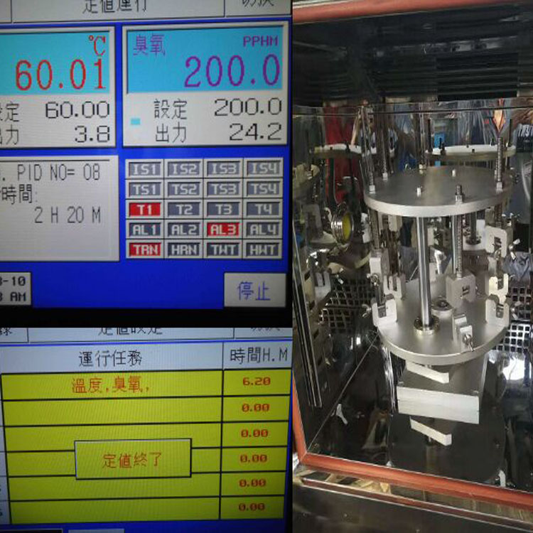 設(shè)備由無(wú)聲高效臭氧發(fā)生器發(fā)生的臭氧氣體,和一定量的已處理的空氣,在交換器中混合后送入試驗(yàn)箱,紫外檢測(cè)儀將連續(xù)在線檢測(cè)到的臭氧濃度,反饋到臭氧發(fā)生器控制系統(tǒng),使控制系統(tǒng)根據(jù)設(shè)定值有效的控制臭氧的發(fā)生,從而試驗(yàn)箱保持合適的臭氧濃度,在由加熱加濕系統(tǒng)工作,滿足所有試驗(yàn)條件.